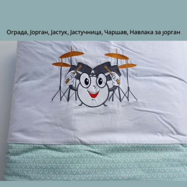 Сетот содржи : оградица,чаршав, јорган, навлака за јорган, перница, навлака за перница