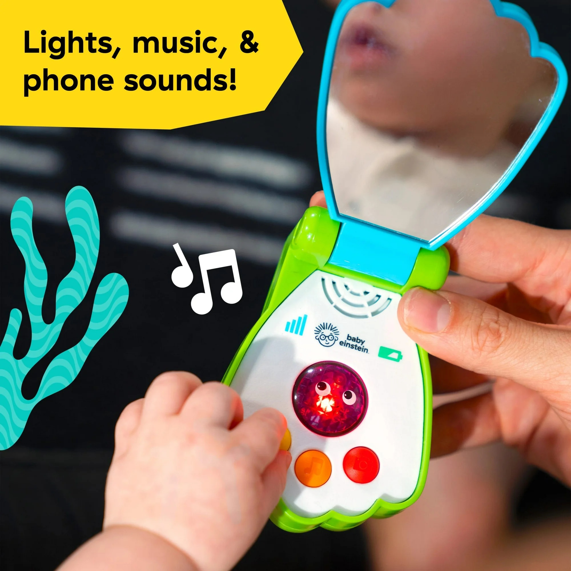Истражете ги бои, светла и звуци од морето со овој шарен музички телефон! Бебето може да го притисне копчето за да слушне мелодии, телефонски звуци и „здраво“ на англиски, француски и шпански. Огледалцето со peek-a-boo ја поттикнува самоспознавањето, а светлата светат во ритам за учење на причина–последица.