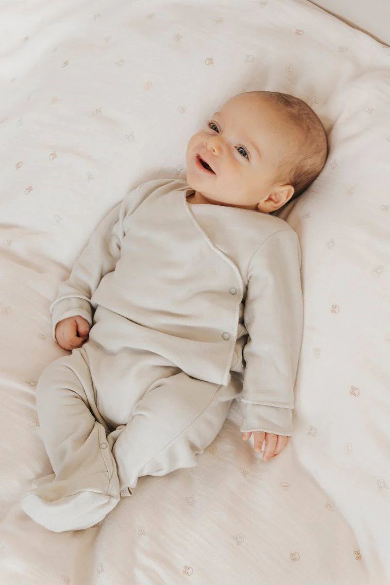 Шпикозни со затворени ногавици, изработена од бамбус вискоза и органски памук — материјали кои се мекани, дишечки и нежни за чувствителната кожа на вашето бебе. Овие шпихозни се удобен, практични и идеални за секојдневни активности, обезбедувајќи удобност и природна грижа до првите чекори.