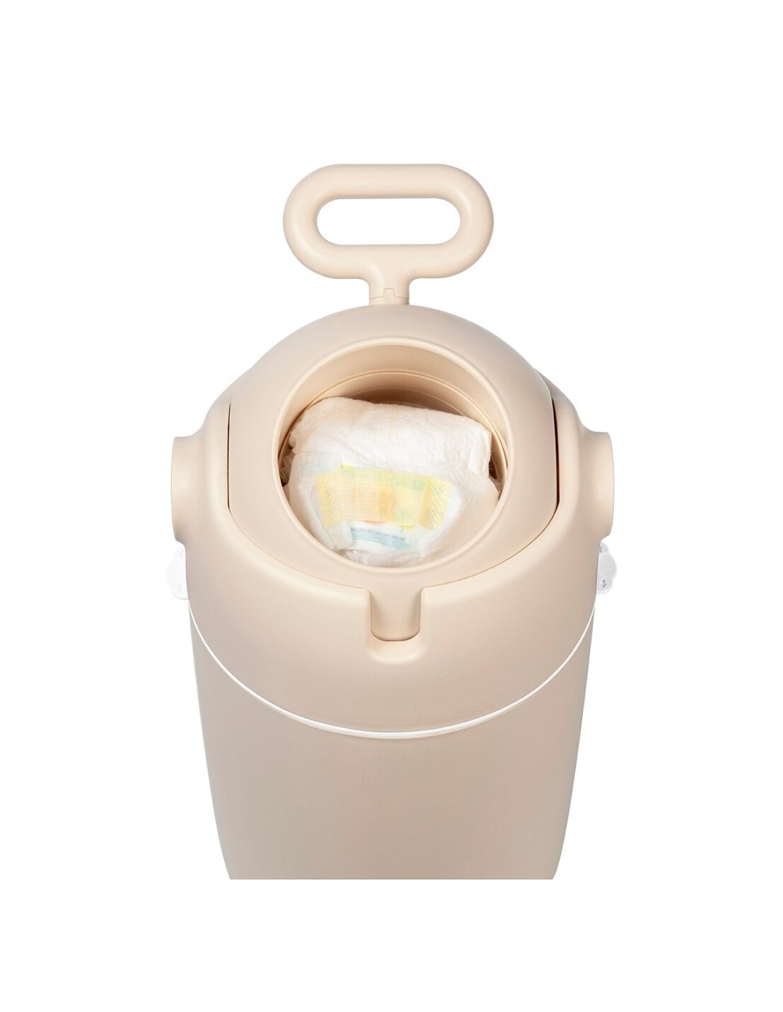 Дизајниран е да ги задржи непријатните мириси внатре, благодарение на специјалниот механизам што го изолира воздухот секој пат кога ја фрлате пелената. Лесен е за користење со една рака, а исто така и за чистење.