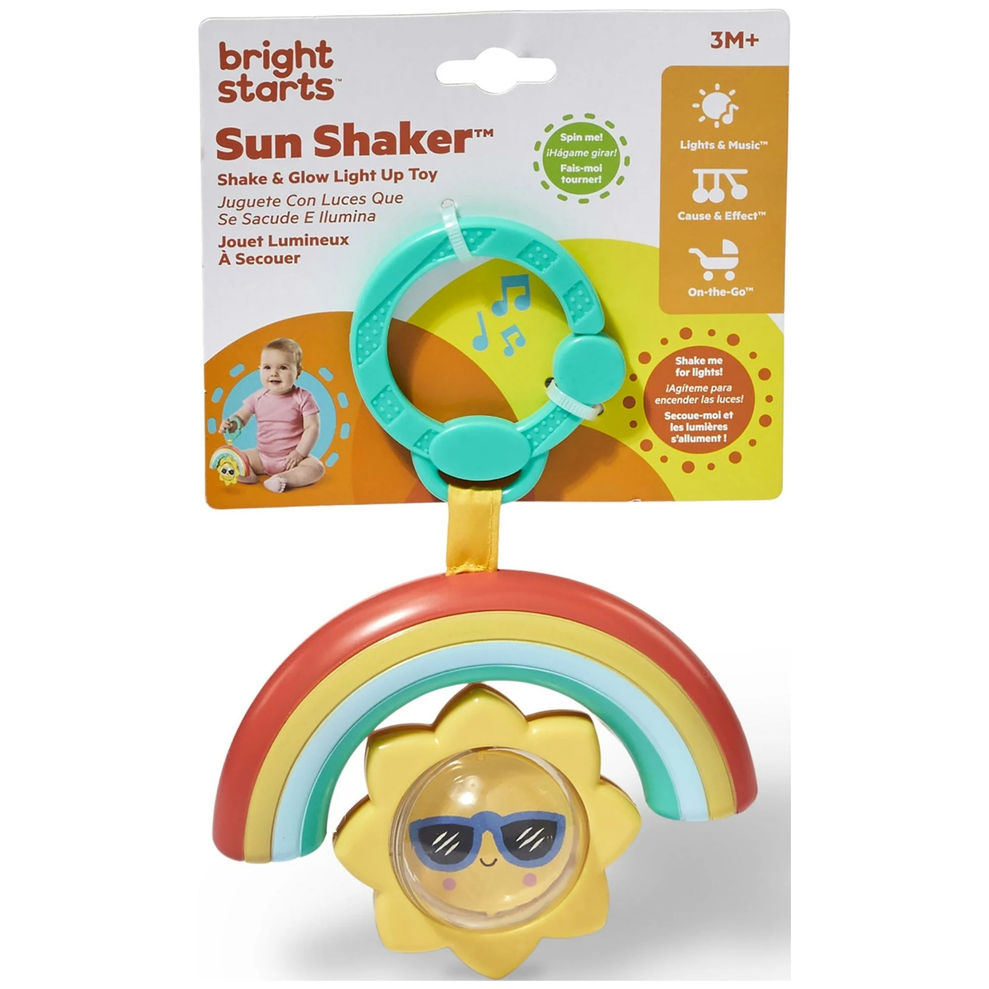 Привлечете го вниманието на вашето бебе со шарената Sun Shaker играчка! Со едноставно тресење, бебето активира светла и весели мелодии, учејќи ја врската причина–последица. Вртливото сонце со изненадувачки лица поттикнува фина моторика и дополнителна забава.