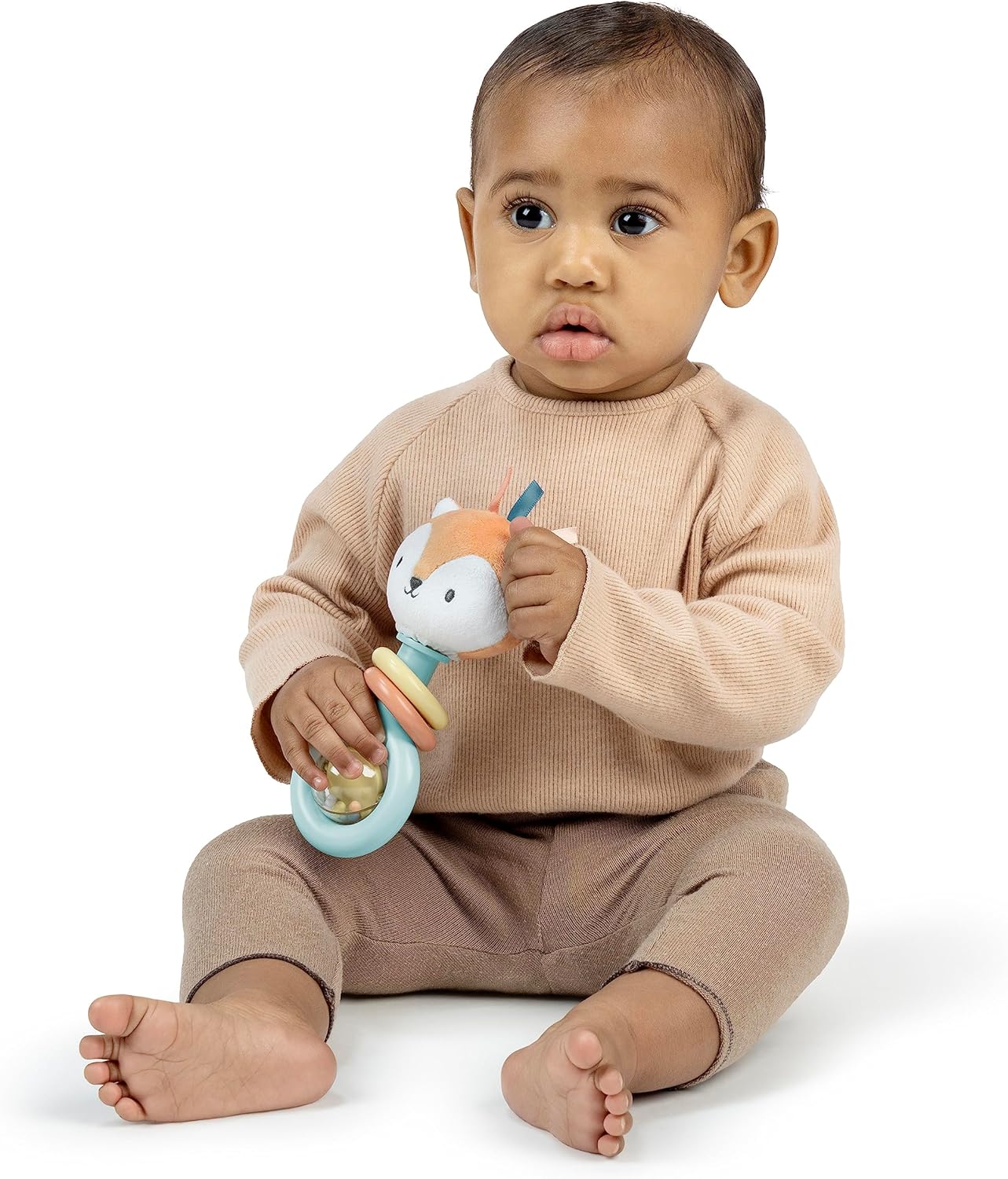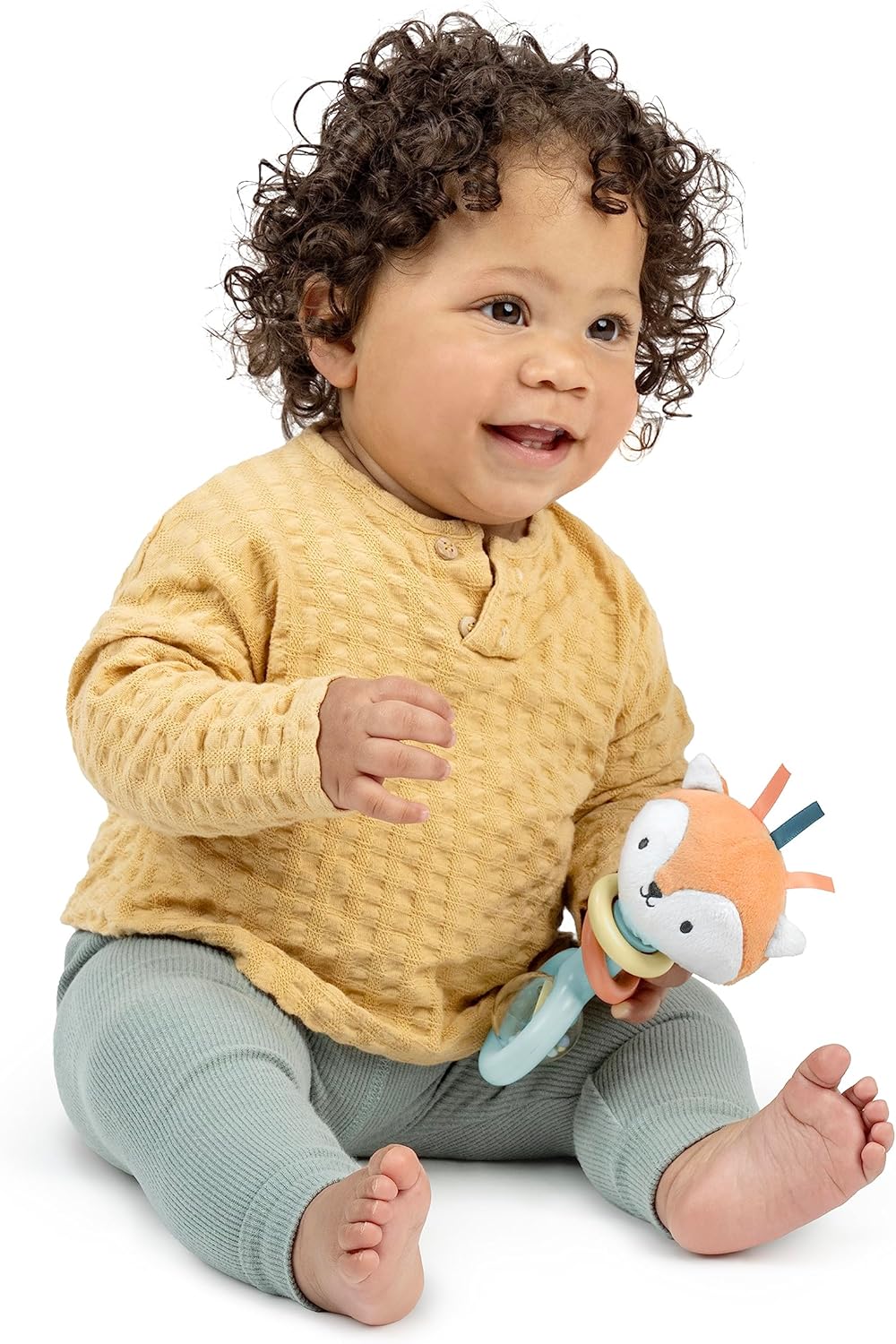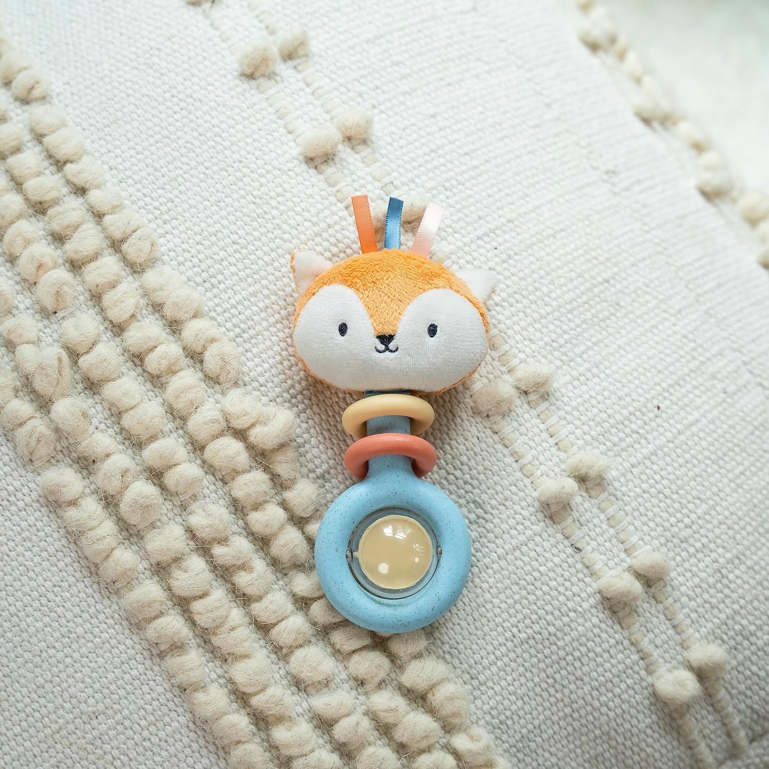 Нежна тропалка со меко плишано лисиче Kitt, изработена од 30% растителни пластики и BPA-free материјали. Лесна и лесна за држење од малите рачиња на бебето, создава нежни звуци што ја поттикнуваат играта, моториката и учењето на причина–последица.
