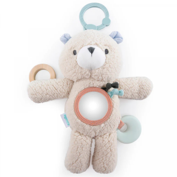 Забавна играчка со смирувачки звуци,глодалка.Штипка со која што може да се закачи на количка,транспортер,кревтче.