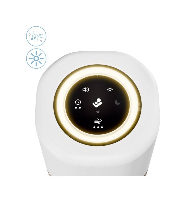 Како 3-во-1 уред, покрај прочистување на воздухот, нуди и прилагодливо LED ноќно светло кое создава пријатна атмосфера, како и четири смирувачки звуци што помагаат бебето полесно да заспие. Сите функции може да се контролираат преку паметна апликација или директно од самиот уред.