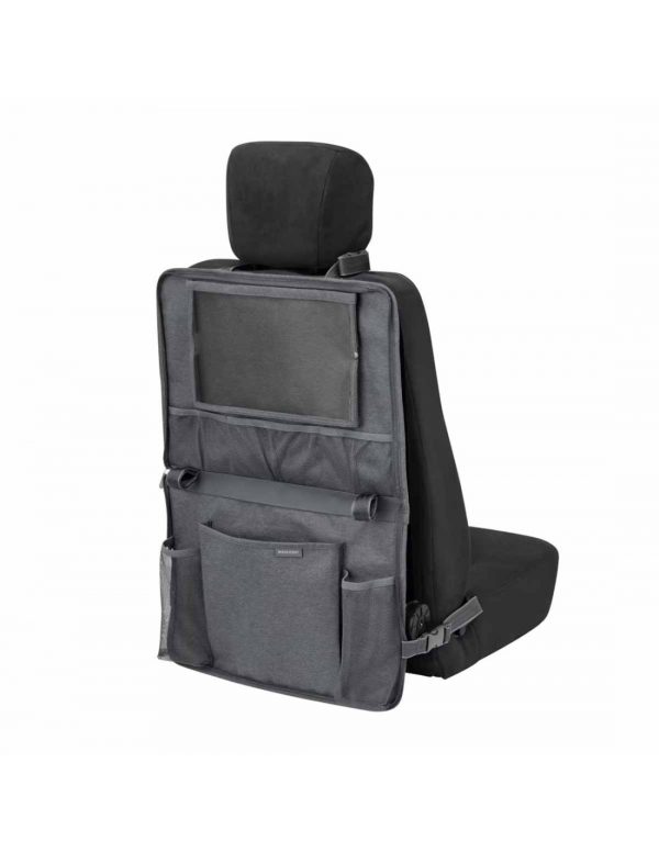 Практичен мултифункционален организер со повеќе прегради и држач за таблет. Лесно се прикачува на автомобилско седиште или детска количка со прилагодливи ремени. Се чисти едноставно со влажна крпа – идеален за уредни и безгрижни патувања.