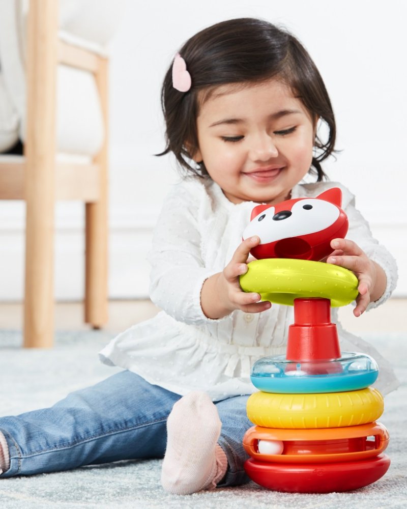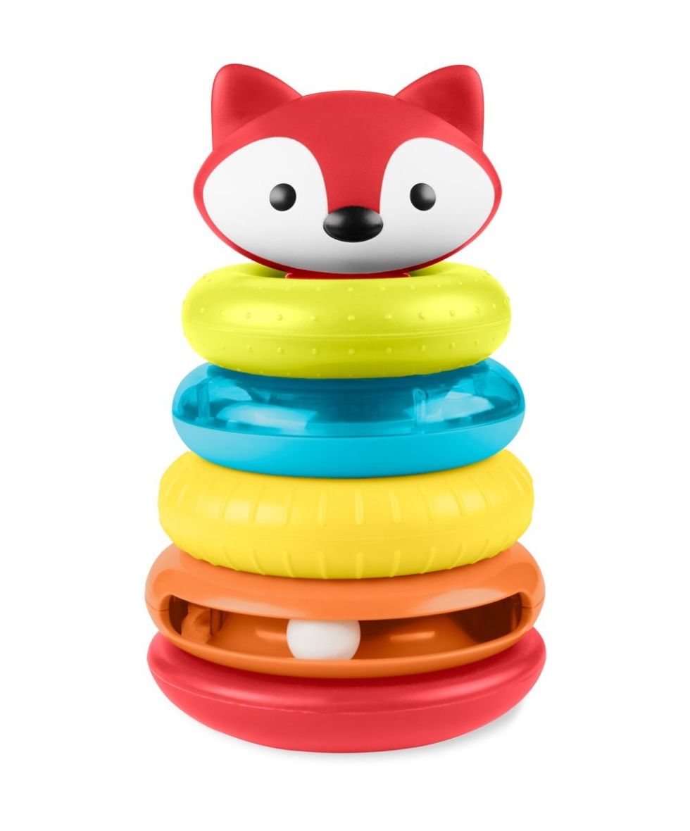 Класична играчка за редење прстени што ја развива фината моторика, координацијата рака-око и сетилното истражување. Бебето ќе ужива во фаќањето и редењето на четирите шарени прстени и плишаната лисичка на врвот, учејќи бои, броење и причина–последица.