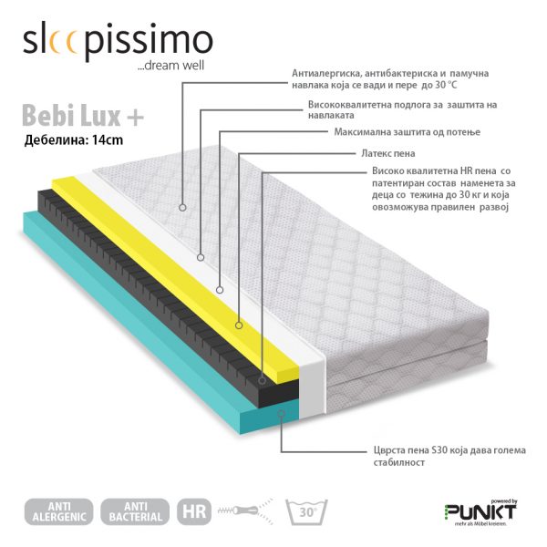 Душекот Беби Лукс + Слиписимо има антиалергиска, антибактериска и памучна навлака која може да се отстрани за перење. Има високо квалитетна подлога за заштита на навлаката, максимална заштита од потење, латекс пена, цврста пена S30 која дава голема стабилност и високо квалитетна HR пена со патентиран состав наменета за деца со тежина до 30 кг која овозможува правилен раст и развој.
