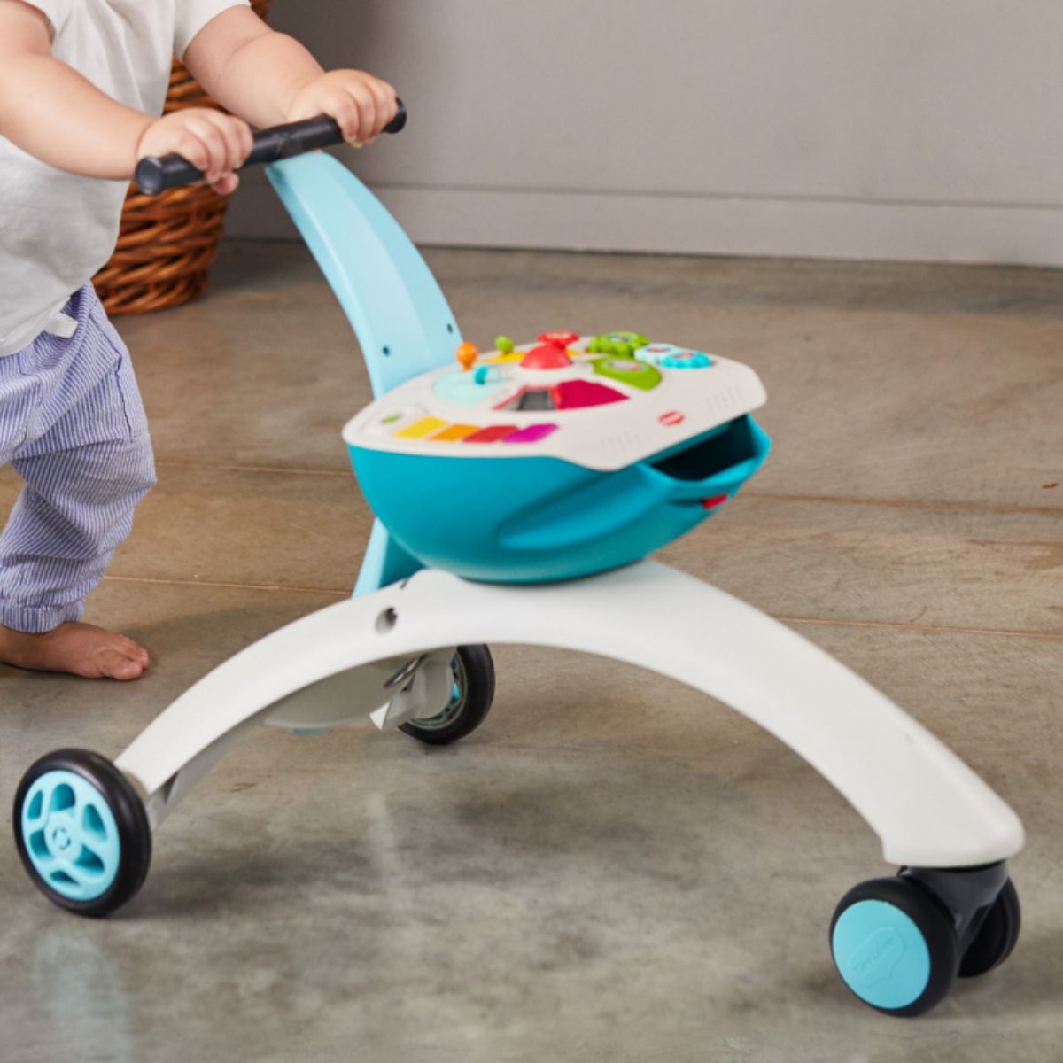 Штом бебињата се чувствуваат посигурни како стојат, почнуваат да бараат нови начини за откривање! Поставете ги тркалата да се забавуваат во режимот одење позади и дозволете му на вашето малечко да ги истражува првите чекори со дополнителна поддршка со користење на безбедносната сопирачка.