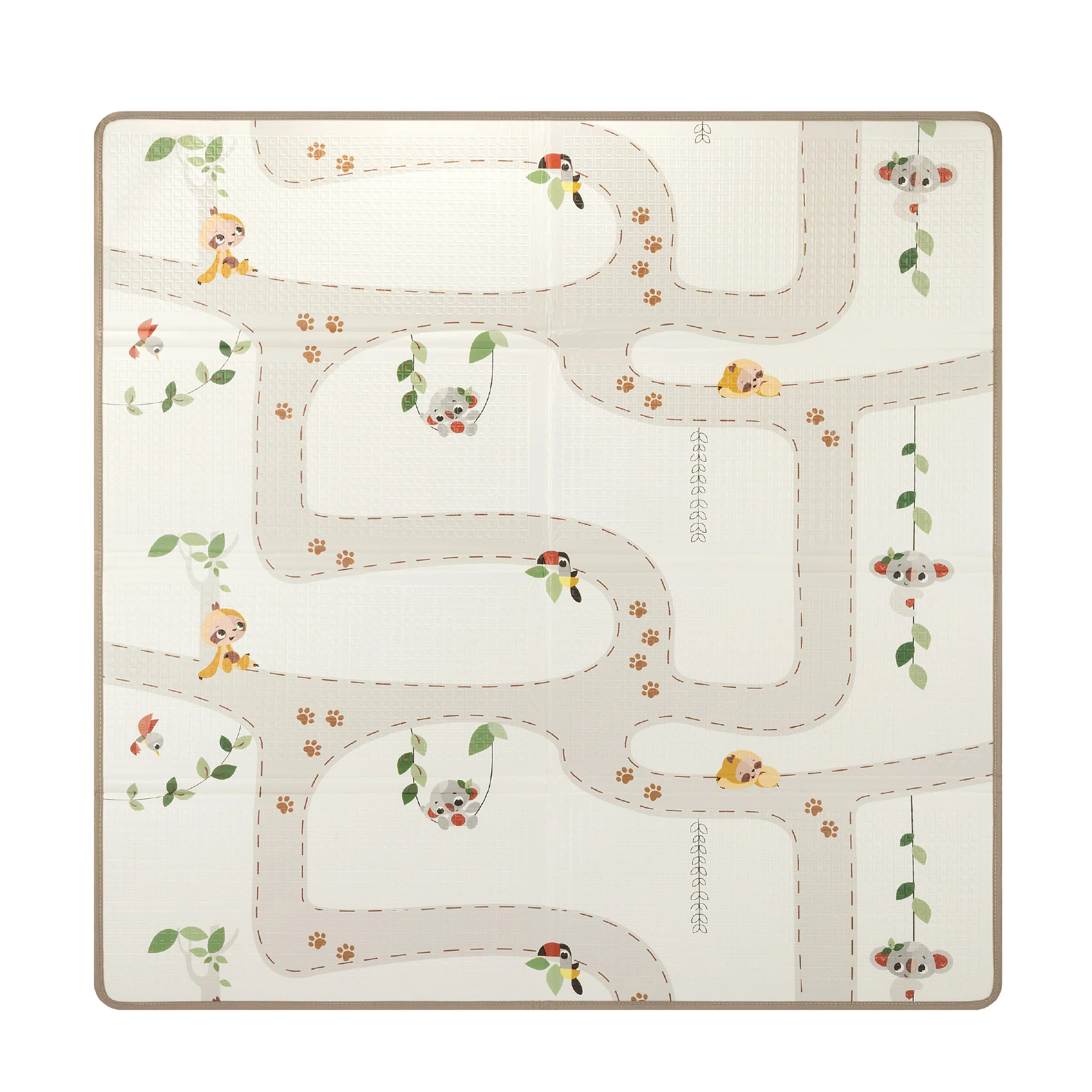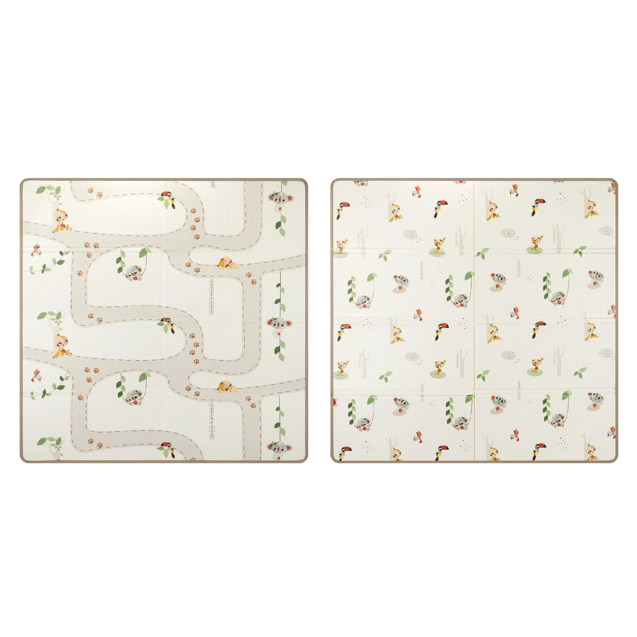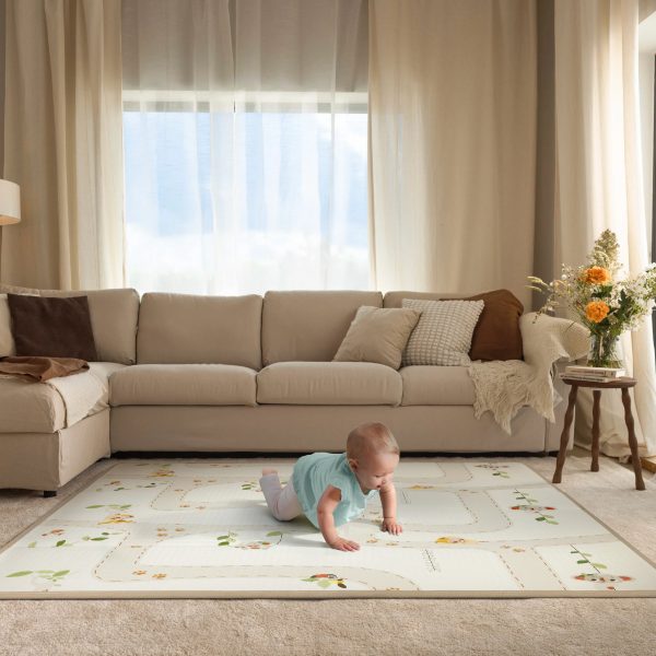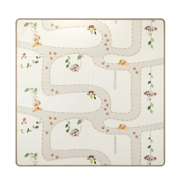 Обезбедува пријатна средина за играње што инспирира движење и имагинативна игра. Расте со вашето бебе! Едната страна има стилски бохо-шик дизајн, додека другата се одликува со забавни кривулести патеки што ги покануваат најмалите да ги создадат своите авантури.