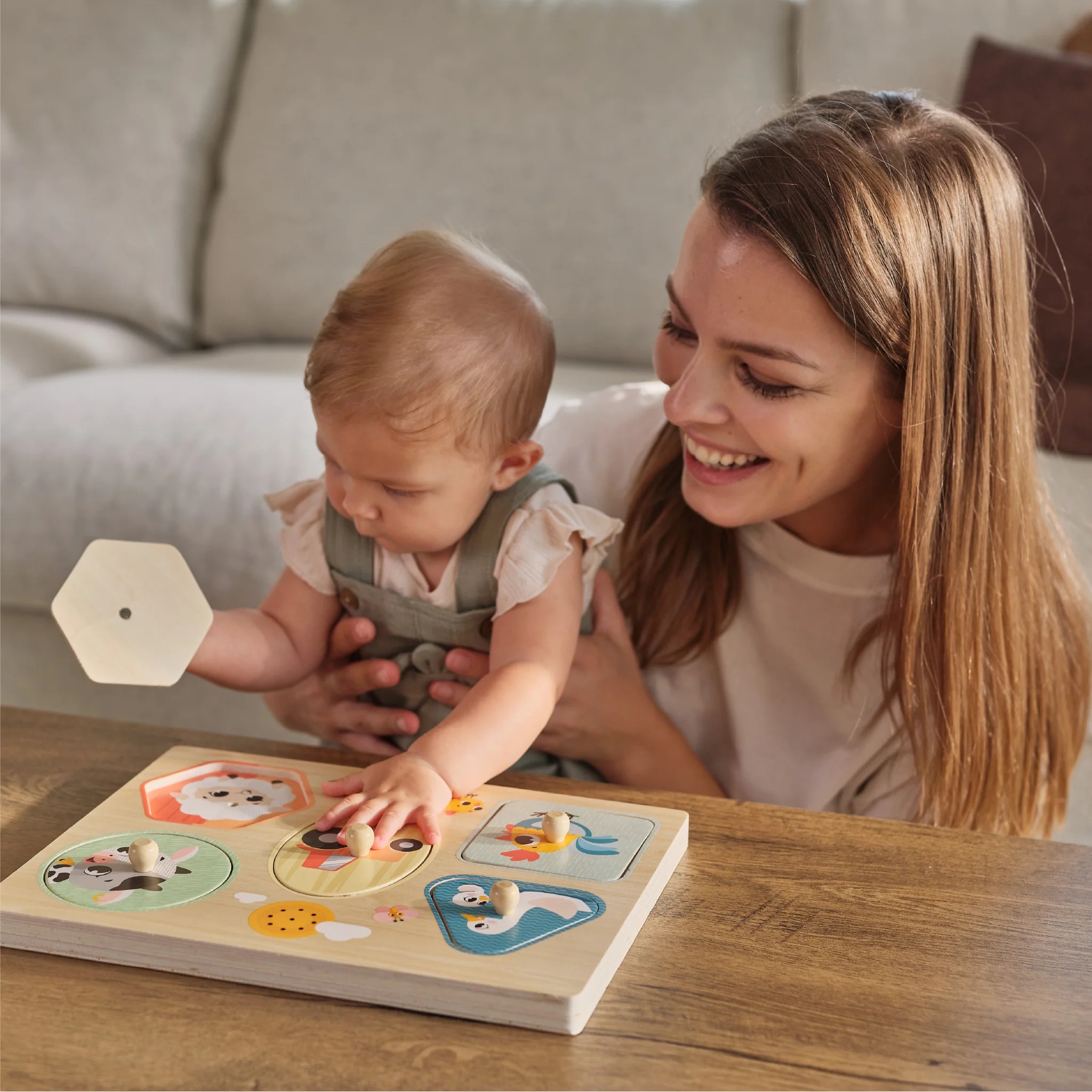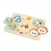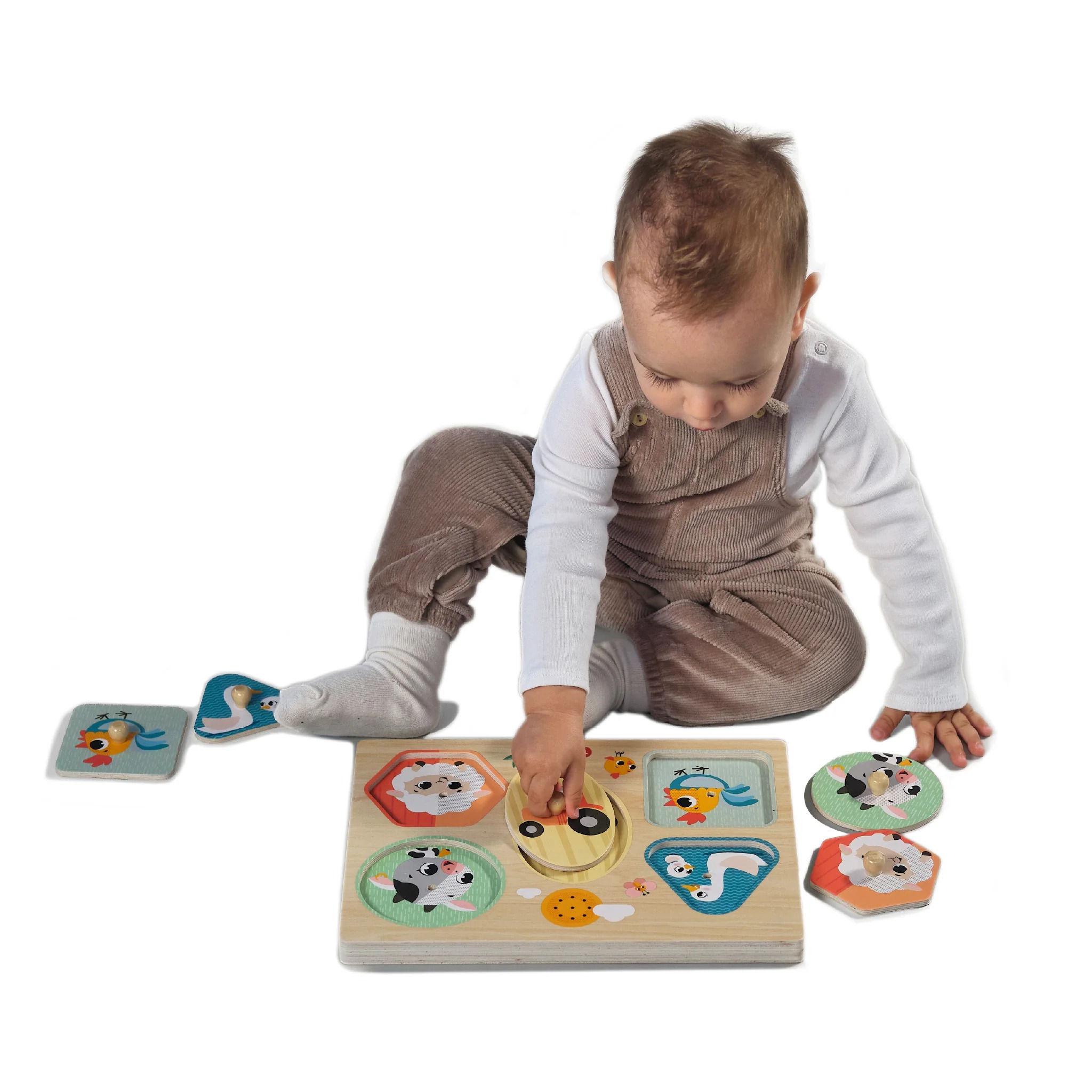 Сложувалка со 5 големи парчиња со животни, лесни за фаќање. Оваа привлечна звучна сложувалка ги запознава бебињата со формите, боите, животните и звуците што ги испуштаат. Поставувањето на секое парче на неговото точно место ги наградува дечињата со соодветен звук од животното, поттикнувајќи рано препознавање на формите, имитација и учење за причина и последица. Како што бебињата ги фаќаат и поставуваат парчињата, тие ги зајакнуваат фината моторика и координацијата око-рака.