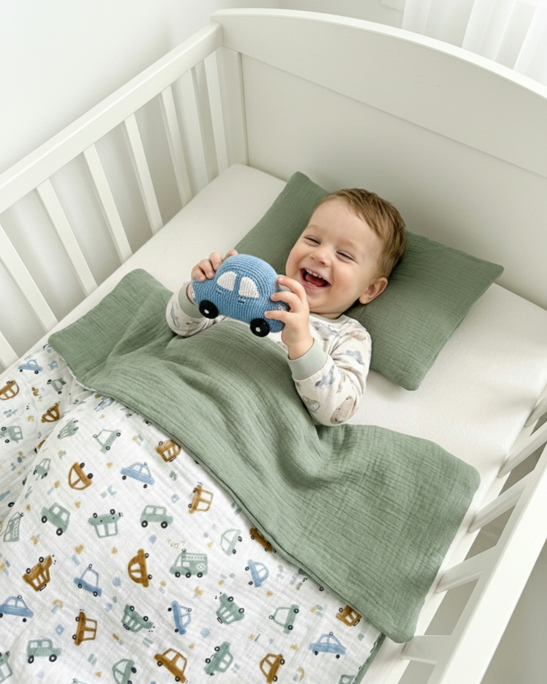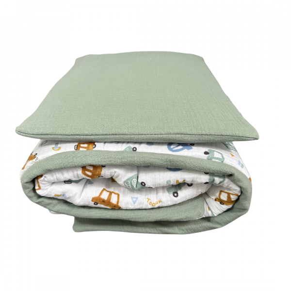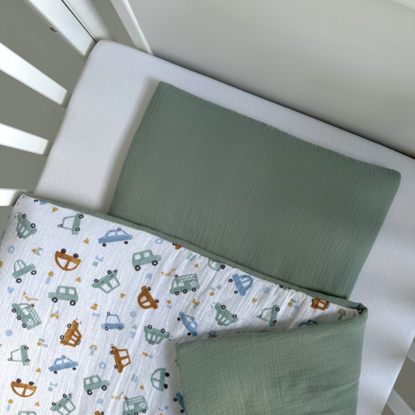Овој сет муслин постелнина од два дела е совршен за удобен и пријатен сон на вашето бебе. Изработен од 100% памучен муслин, обезбедува мекост и топлина без прегревање. Муслинот е природен материјал што го прави спиењето пријатно и нежно за чувствителната бебешка кожа.