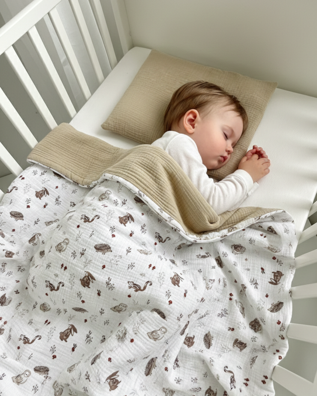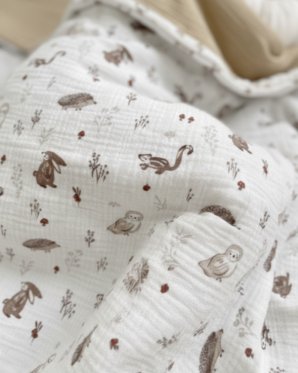 Овој сет муслин постелнина од два дела е совршен за удобен и пријатен сон на вашето бебе. Изработен од 100% памучен муслин, обезбедува мекост и топлина без прегревање. Муслинот е природен материјал што го прави спиењето пријатно и нежно за чувствителната бебешка кожа.