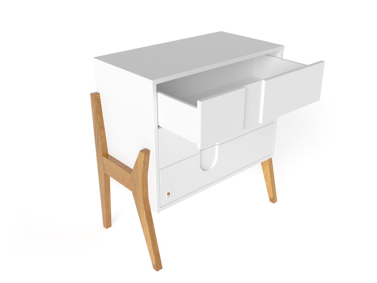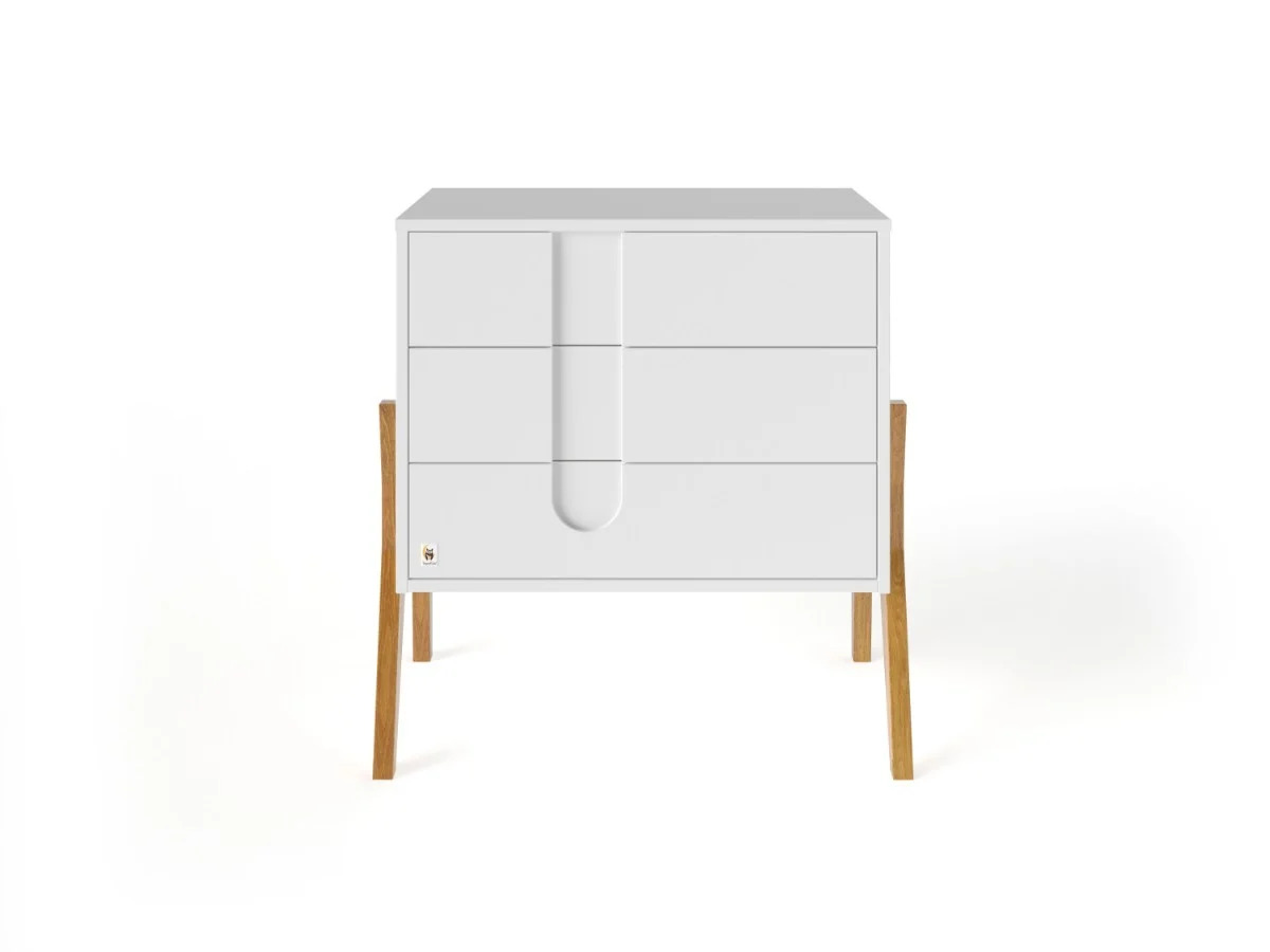 Комодата е внимателно дизајнирана  има 3 пространи фиоки, кои нудат доволно простор за сите неопходни работи за вашето бебе, без да заземаат премногу место. Дополнително, можете да ја купите и дабовата подлога за повивање, која хармонично се вклопува во дизајнот на комодата.